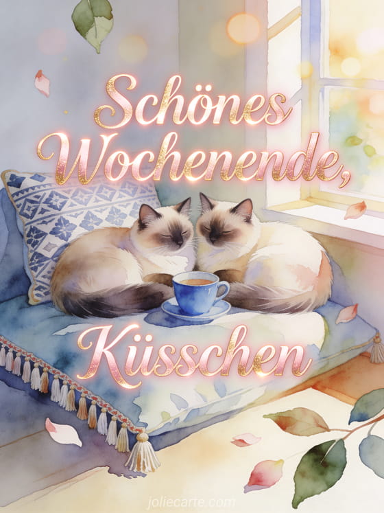 Sende einen gemütlichen Gruß zum schönen Wochenende mit zwei Birma-Katzen, einer blauen Tasse und warmem Aquarellzauber. Entdecke auch eine Bilder schönes Wochenende Küsse, eine schönes Wochenende Frühling oder eine schönes Wochenende Küsse gif.