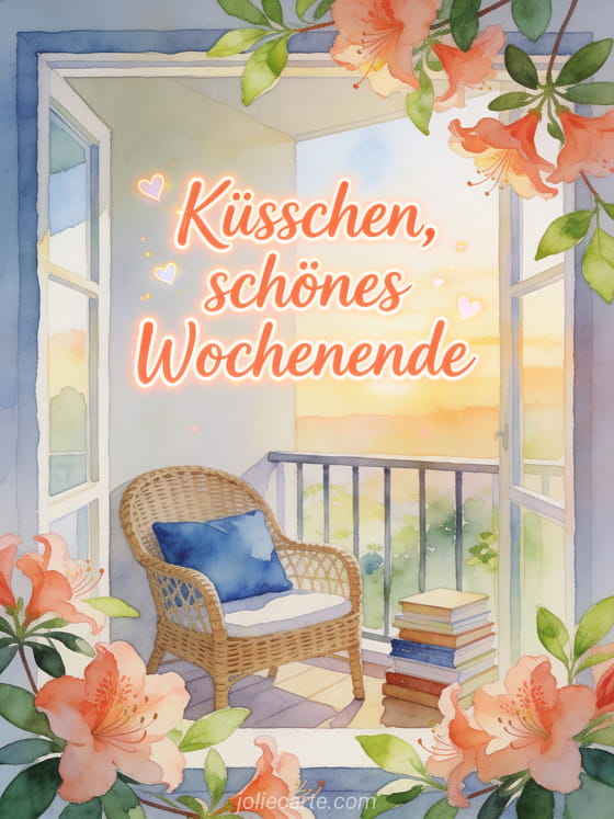 Teile einen warmen Wochenendgruß mit korallfarbener Aquarellschrift, Azaleen über dem Rand, einem gemütlichen Balkon, einem Korbsessel mit blauem Kissen und gestapelten Büchern. Entdecke auch eine dicke Küsse und schönes Wochenende, eine schönes Wochenende und dicke Küsse Karte oder einen Gruß mit Küsschen schönes Wochenende.