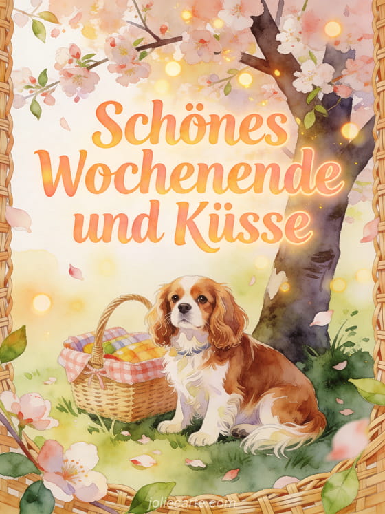 Teile einen zärtlichen Wochenendgruß mit dieser Aquarellkarte voller warmem Licht, Blütenblättern und entspannter Freude. Entdecke auch schönes Wochenende animierte Küsschen, schönes Wochenende Küsschen Foto oder Huhu schönes Wochenende Küsschen.