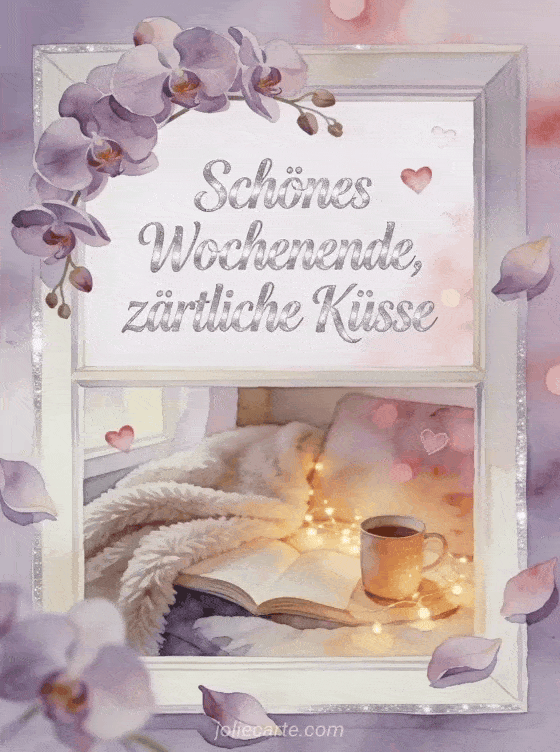 Teile ein Schönes Wochenende Küsse GIF Bild mit lavendelfarbener Schrift, Orchideenblüten, einer gemütlichen Leseecke, weicher Decke, warmer Tasse, Lichterkette und Herzen. Du kannst auch schönes Wochenende und Küsschen, schönes Wochenende dicke Küsse oder Wochenendküsse senden.