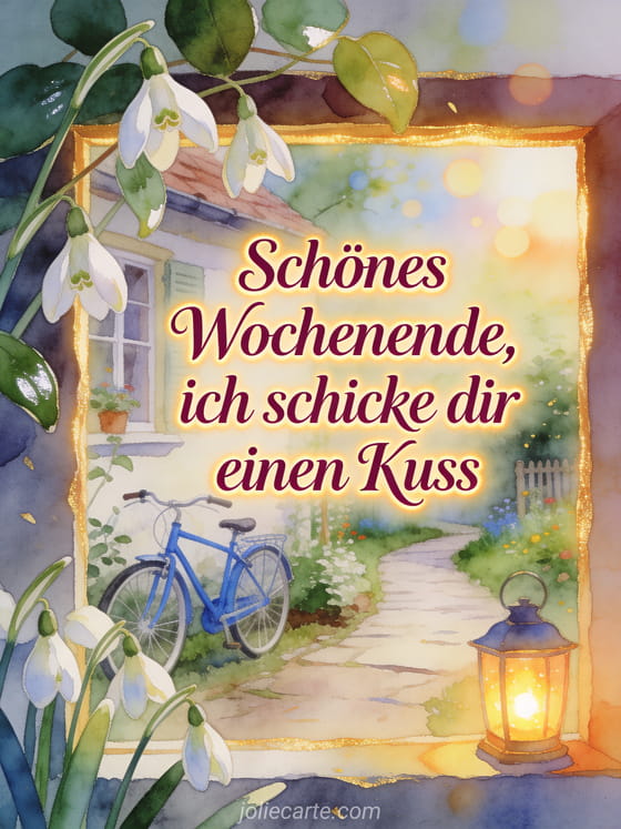 Sende einen zärtlichen schönes Wochenende Gruß mit einem Kuss, Schneeglöckchen über dem Rand und einem Bauerngartenweg mit blauem Fahrrad und leuchtender Laterne. Entdecke auch hab ein schönes Wochenende Küsse, Zärtlichkeit schönes Wochenende Küsschen oder schönes Wochenende Küsse.