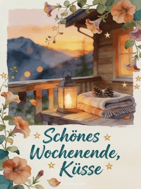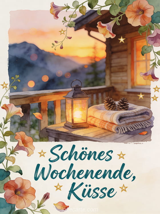 Teile schönes Wochenende mit Küssen durch eine Aquarellkarte mit Bergchalet-Veranda, leuchtender Laterne, gefalteter Decke, Zapfen und hängenden Petunien. Entdecke auch eine Karte mit Schönes Wochenende Küsse GIF Bild, schönes Wochenende und Küsschen oder schönes Wochenende dicke Küsse.