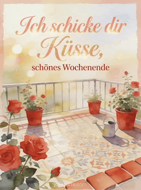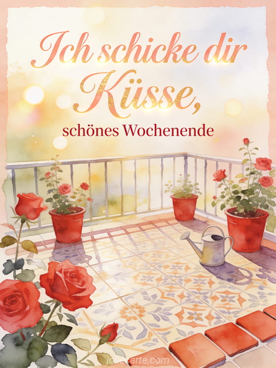 Sende eine gelassene Wochenendkarte mit Aquarellschrift, roten Rosen in Töpfen, einer sonnigen Terrasse mit Fliesen und einer kleinen Gießkanne. Entdecke auch eine gif schönes Wochenende Küsse, eine schönes Wochenende Küsschen GIF oder eine Küsschen schönes Wochenende.