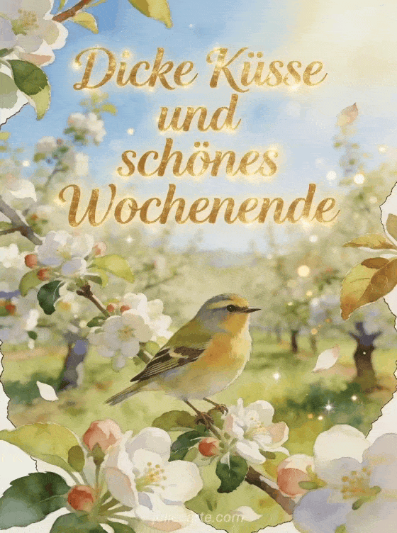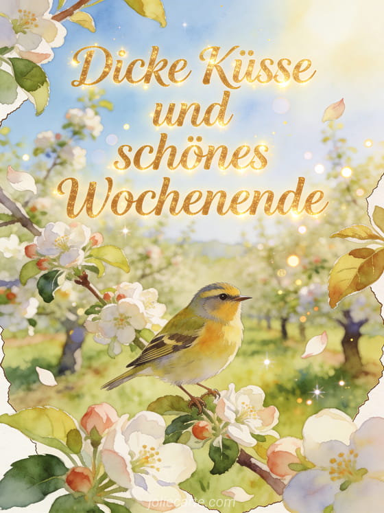 Teile luftige Wochenendsüße mit dieser Aquarellkarte, auf der ein Girlitz in einem hellen Obstgarten zwischen Blüten, Blütenblättern und frischen Blättern sitzt. Entdecke auch Küsschen schönes Wochenende, dicke Küsse schönes Wochenende oder schönes Wochenende animiertes Küsschen.