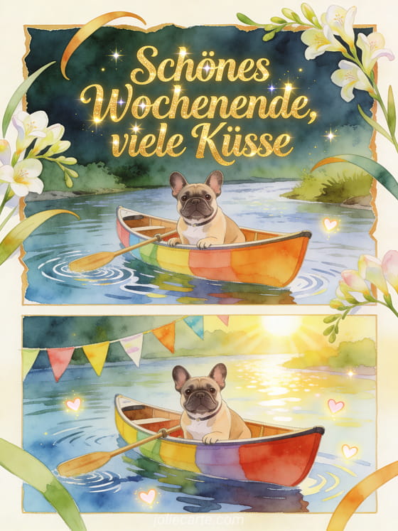 Sende ein fröhliches schönes Wochenende mit goldener Schrift, funkelnden Akzenten und vielen Küssen. Diese kostenlose Karte zeigt Freesienblüten, Herzlichter und eine Französische Bulldogge in einem bunten Kanu auf einem ruhigen Fluss. Entdecke auch Schönen Freitag schönes Wochenende Küsse, Kostenlose Bilder schönes Wochenende Küsse oder schönes Wochenende Küsse gifs.