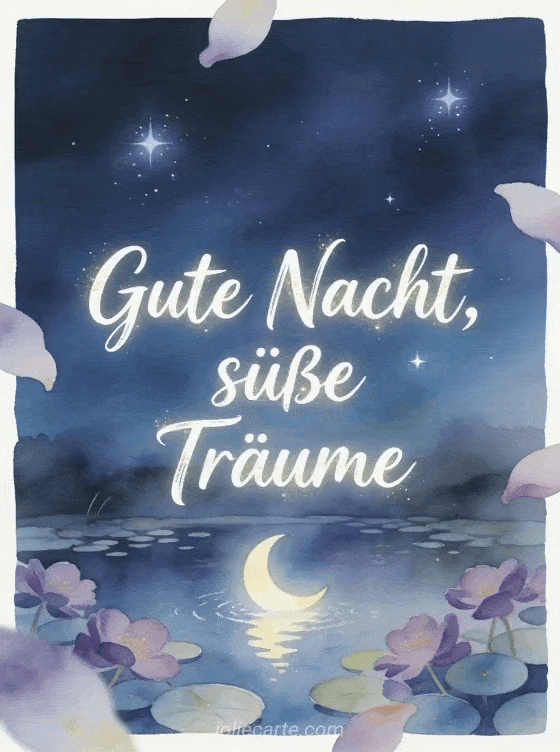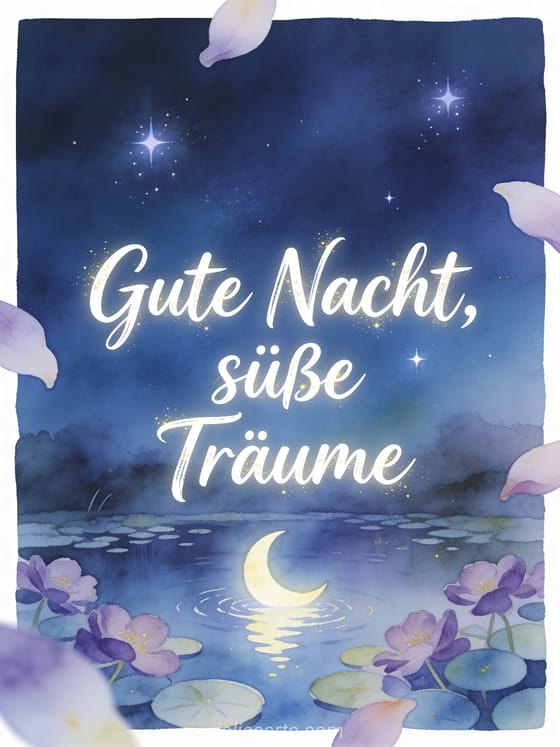 Teile eine Gute-Nacht-Nachricht mit einem ruhigen mondbeschienenen Teich, einer Mondsichel im Wasser, Veilchen, runden Blättern und leuchtenden Sternen. Entdecke auch eine kostenlose virtuelle Gute-Nacht-Karte, eine Gute-Nacht-Karte Küsse oder eine Gute Nacht Nachricht für seine Frau.