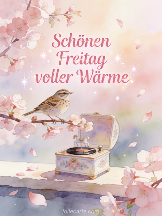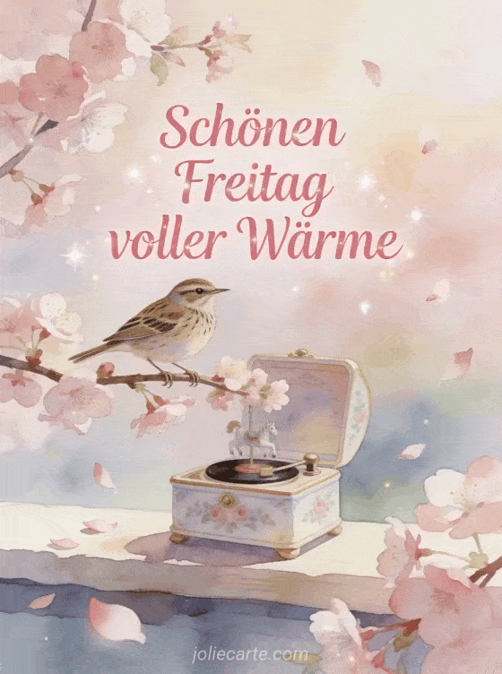 Sende einen zarten Gruß zum schönen Freitag mit weicher rosa Pinselschrift, Kirschblüten, treibenden Blütenblättern, einem Pipit auf einem blühenden Zweig und einer kleinen Porzellan-Spieluhr im warmen Frühlingslicht. Teile auch ein Schönen Freitag glitzerndes GIF, ein schönen freitag schönes bild oder ein Schönen Freitag regnerisches GIF.