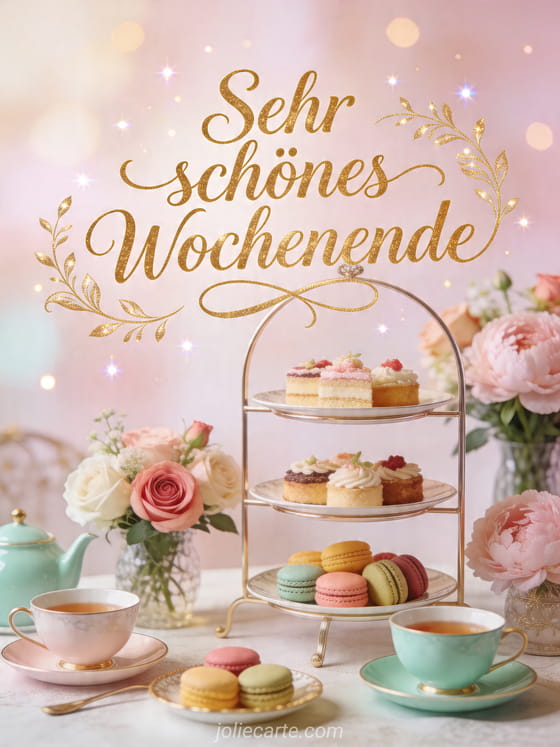Verschicke einen raffinierten Wochenendgruß mit dieser eleganten Karte voller Teezeit, Blumen und zarter Macarons. Entdecke auch schönes wochenende positiv, schönes wochenende verbringen oder schönes wochenende.