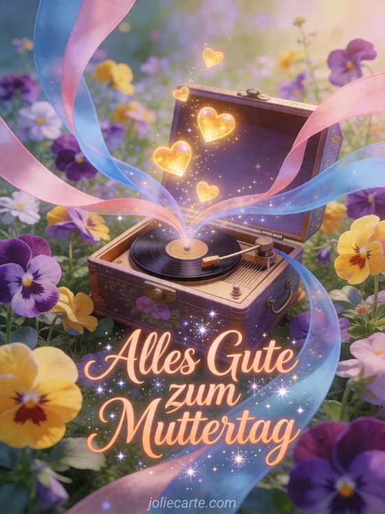 Teile eine Skizze zum Muttertag mit apricotfarbener Kalligrafie, Sternenstaub und einer verzauberten Wiese voller Stiefmütterchen rund um eine offene Spieluhr. Mit wirbelnden Bändern und leuchtenden Herzen entsteht eine traumhafte Feier. Entdecke auch Fotos vom Muttertag, Muttertagspoesie oder Kompliment zum Muttertag.
