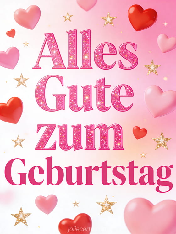 Schicke eine fröhliche Geburtstagskarte mit leuchtend rosa Glitzer-Buchstaben, rosa und roten Herzen verschiedener Größen, die zwischen goldenen funkelnden Sternen schweben, auf rosafarbenem Verlaufshintergrund. Entdecke auch eine Geburtstagskarte mit Katze für Frauen oder Geburtstagstext Frau Karte.