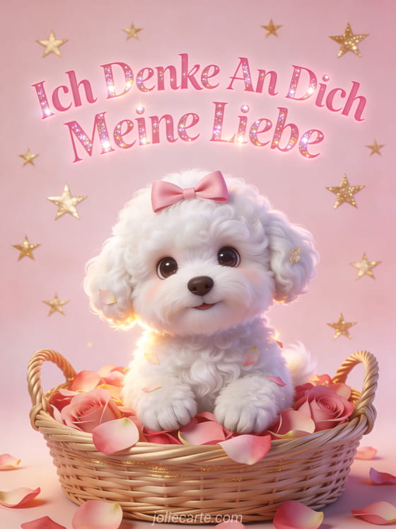 Senden Sie diese entzückende Grußkarte mit einem süßen weißen Bichon Frisé mit rosa Schleife in einem Korb mit Rosenblättern. Entdecken Sie auch eine Karte ich denke an dich mein Schatz oder eine Karte Zitat ich denke an dich.