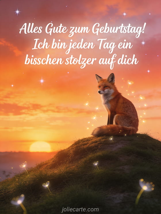Teile eine berührende Geburtstagskarte für deinen Sohn mit einem roten Fuchs auf einem Hügel bei Sonnenuntergang, orange-rosa Himmel, ersten Sternen und Glühwürmchen. Entdecke auch eine Geburtstagskarte mein Sohn, eine Geburtstag Sohn Karte oder eine Alles Gute zum Geburtstag mein Sohn Karte.