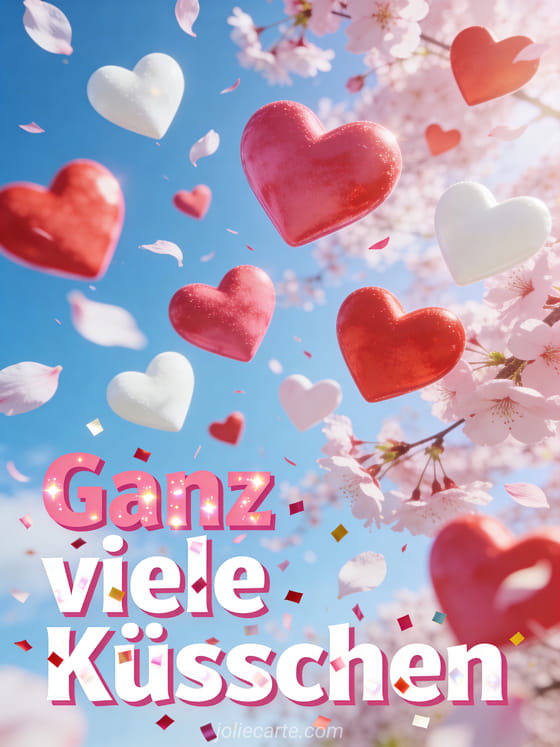 Sende ganz viele Küsschen mit dieser fröhlichen Karte voller rosafarbener Herzen und Kirschblütenblätter, die in einem Frühlingshimmel wirbeln. Entdecke auch ganz nasse küsschen oder zeichnung mädchen küsschen.