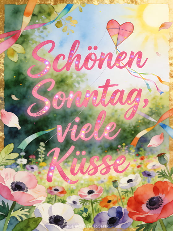 Sende schönen Sonntag, viele Küsse mit lebendiger rosa Schrift, einem herzförmigen Drachen über einem hellen Anemonengarten und bunten Bändern. Entdecke auch Schönen Sonntag religiöses GIF, Karten um schönen Sonntag zu wünschen oder Schönen Sonntag regnerisches Bild.