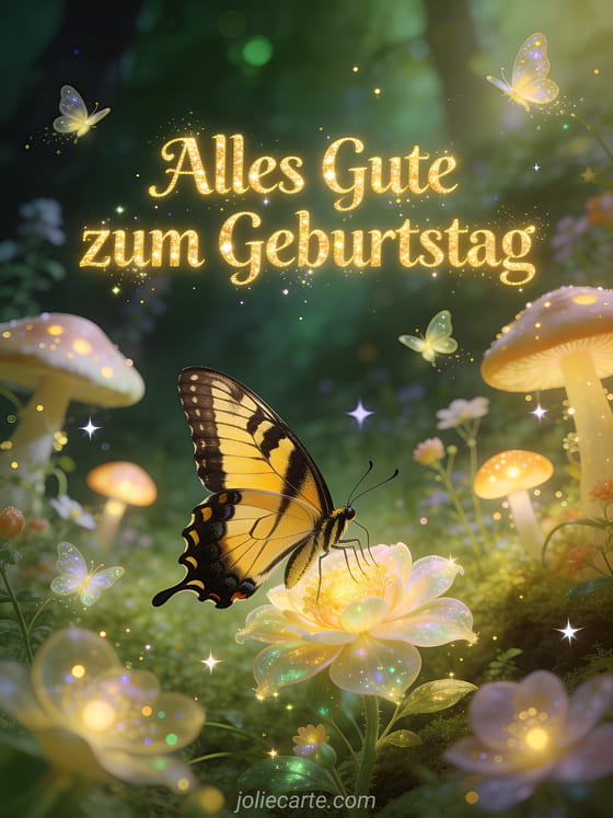 Alles Gute zum Geburtstag ein magischer Schmetterling in einer verzauberten Lichtung