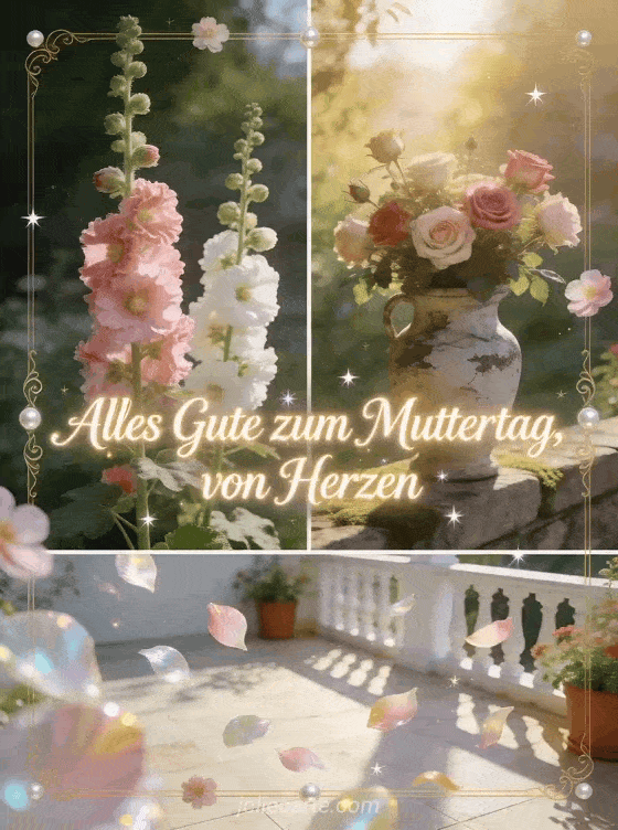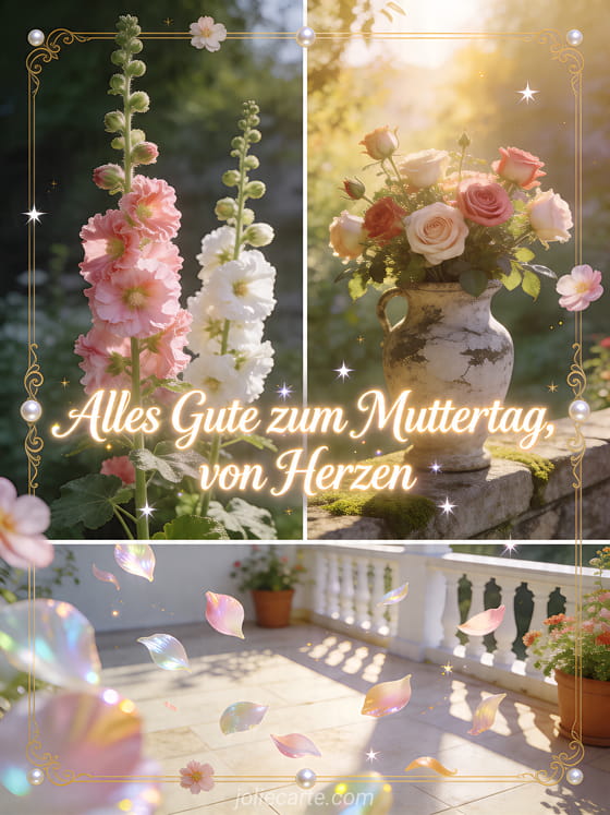 Teile eine elegante Muttertagskarte mit leuchtender Schrift, hohen Stockrosen, einer sonnigen Steinvase, einer hellen Terrasse und schimmernden Blütenblättern. Entdecke auch Alles Gute zum Muttertag für meine Tante, einen Text über Muttertag oder Muttertagsbotschaften.