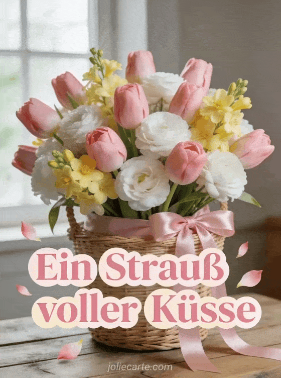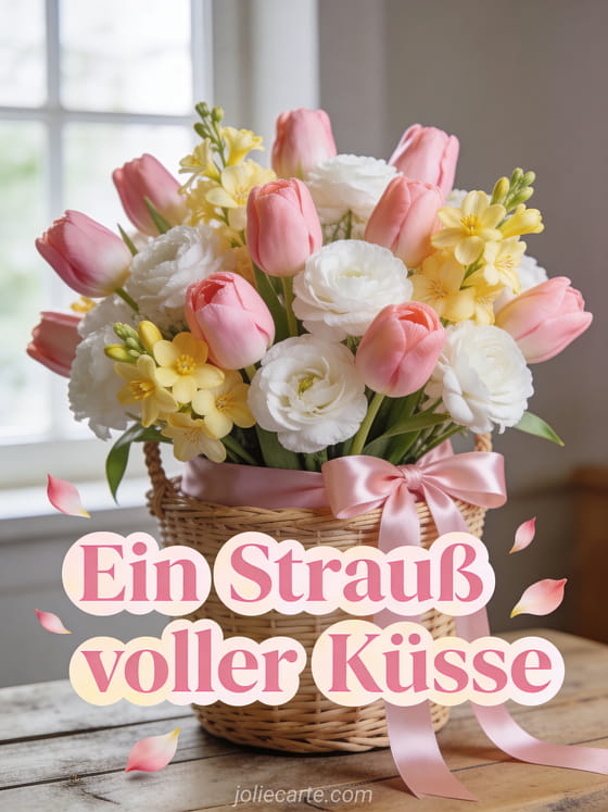 Schicke einen prachtvollen Strauß voller Küsse mit dieser Blumenkarte. Entdecke auch eine Umarmungen-Küsse-Liebe-Paar-Karte oder eine SMS-Küsschen-Karte.