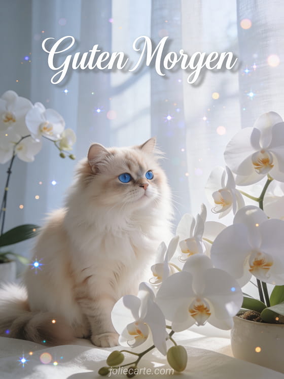 Sende diesen eleganten Guten-Morgen-Gruß mit einer flauschigen Perserkatze die zwischen weißen Orchideen im sanften Morgenlicht sitzt. Entdecke auch eine Karte Guten Morgen wie geht es dir oder eine Guten-Morgen-Karte.
