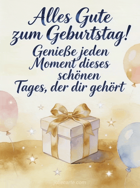 Sende einen Text für Geburtstag mit einer leuchtenden Karte aus Geschenk, Pastellballons und goldenen Sternen für einen einzigartigen Tag. Entdecke auch Text Geburtstagskarte, Geburtstagsnachricht und Geburtstagsnachricht SMS.