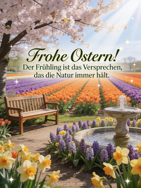 Feiern Sie Ostern mit dieser bezaubernden kostenlosen animierten Grußkarte mit ein friedlicher Keukenhof-Garten mit einer Holzbank unter einem Kirschbaum, Tulpenfelder in Orange und Violett und ein Steinbrunnen umgeben von Hyazinthen und Narzissen. Entdecken Sie auch jolie carte animée de paques carte animée paques.