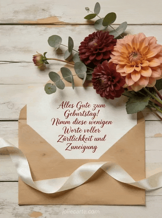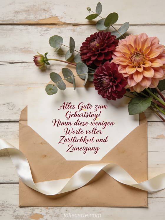 Sende einen gefühlvollen Geburtstagskartentext mit feiner Blumenkomposition, altem Briefumschlag-Charme und warmem nostalgischem Stil. Entdecke auch Geburtstagsnachricht, Geburtstagsnachricht SMS und geburtstagsnachricht senden.