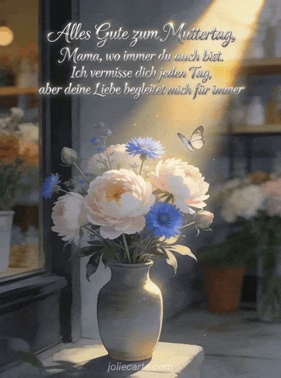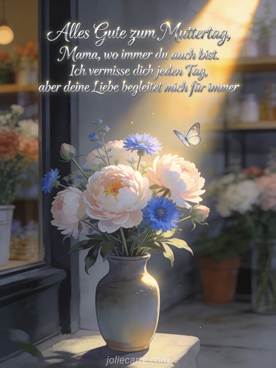 Sende diese liebevolle Erinnerung, um deine Mama mit Licht und Liebe zu ehren. Entdecke auch Liebesgedicht zum Muttertag, Muttertag Zeichnung in Farbe oder Strauß Muttertag.