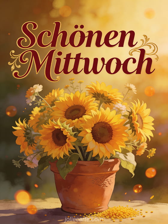 Sende einen herzlichen Gruß zum schönen Mittwoch mit Sonnenblumen in einem rustikalen Terrakottatopf, goldenem Sommerlicht und sanftem Landcharme. Entdecke auch Schönen Mittwoch mit Tieren, Schönen Tag Guten Morgen schönen Mittwochstag oder animiertes Schönen-Mittwoch-Bild.