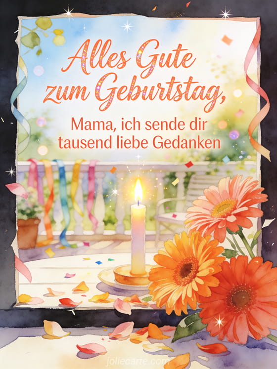 Sende deiner Mama eine liebevolle Geburtstagsbotschaft mit korallfarbener Kalligrafie, leuchtenden Gerbera, einer brennenden Kerze und einer fröhlichen Patioszene. Teile auch ein animiertes GIF Alles Gute zum Geburtstag Mama GIF, einen Alles Gute zum Geburtstag Mama einfacher Text oder einen Alles Gute zum Geburtstag Schwiegermama Text.