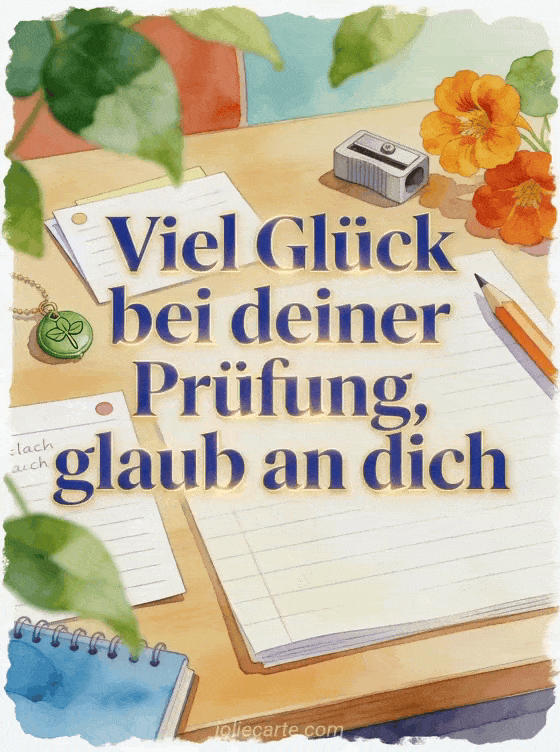 Unterstütze jemanden vor einer Prüfung mit dieser selbstbewussten Aquarellkarte, mit Lernkarten, einem Glücks-Spitzer, einem grünen Glücksbringer und Kapuzinerkresse. Entdecke auch animierte Viel Glück GIFs, Viel-Glück-Nachricht für einen Wettbewerb oder Viel Glück Bild mit einem Pferd.
