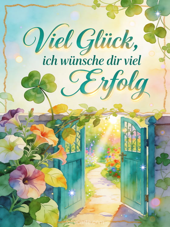 Wünsche viel Glück mit einer smaragdgrünen Botschaft, einem vierblättrigen Klee, einem offenen Gartentor und Petunien an einem sonnigen Weg. Entdecke auch Viel Glück bei deiner Prüfung Bild, Viel Glück bei Prüfung Karte oder Text viel Glück neuer Job.
