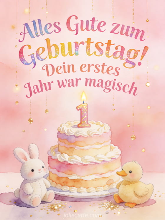Feiere ein magisches erstes Jahr mit einer sanften Aquarell-Geburtstagskarte, die einen schönen Etagenkuchen mit Zahl-1-Kerze, pastellfarbener Creme, einem Plüschhasen und einer Ente rund um den Kuchen sowie goldenen Glanz auf puderrosa Hintergrund zeigt. Entdecke auch Alles Gute zum Geburtstag mein Baby, Alles Gute zum Geburtstag mein einjähriges Baby oder Text erster Geburtstag Baby.