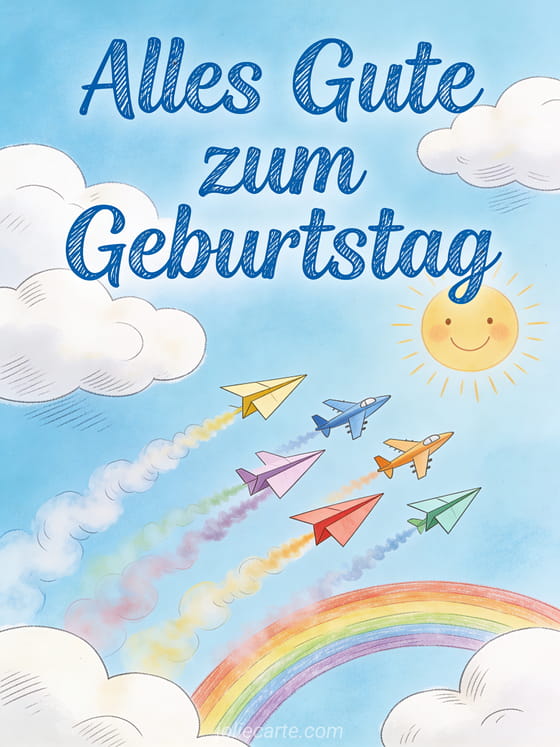 Senden Sie einen fröhlichen Geburtstagstext für Ihren Enkel mit bunten Papierflugzeugen, die in Formation durch einen blauen Himmel fliegen, Regenbogen-Rauchspuren und weichen weißen Wolken. Entdecken Sie auch Alles Gute zum Geburtstag mein lieber Enkel, Geburtstagstext für meinen Enkel oder Winterschlussverkauf 2022 Auchan.