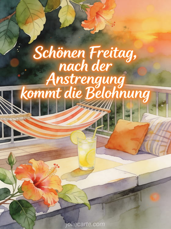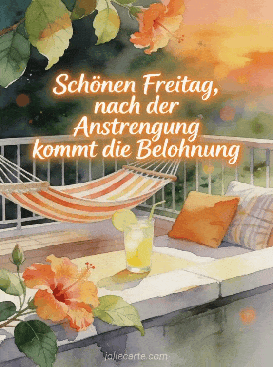 Wünsche einen erholsamen Freitag mit orangefarbener Sonnenuntergangsschrift, Hibiskusblüten, einer ruhigen Terrasse, einer gestreiften Hängematte, Limonade und warmem Licht. Entdecke auch schönen Freitag Schmetterling Bild, Schönen Freitag animierte Bilder oder ein schönen Freitag animiertes gif Bild.