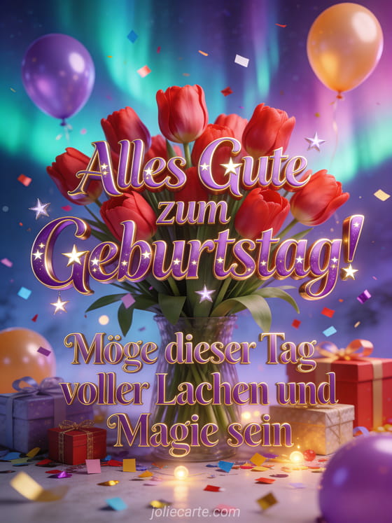 Feiern Sie einen magischen Geburtstag mit dieser bezaubernden Fantasy-Karte mit leuchtenden roten Tulpen umgeben von buntem Konfetti, Geschenken, Ballons und farbenfrohen Nordlichtern am Himmel. Entdecken Sie auch eine Geburtstagskarte für Kinder oder eine Geburtstagskarte für Mädchen.