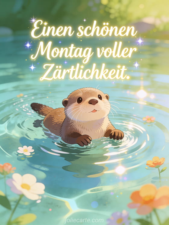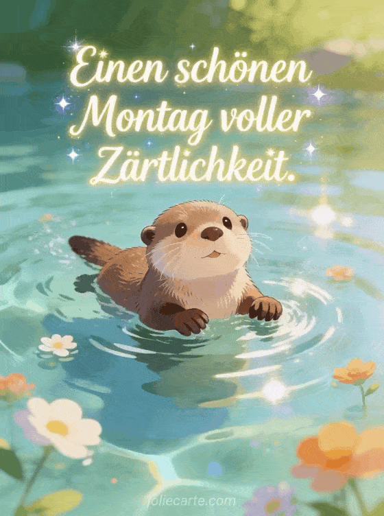 Sende einen zärtlichen Gruß zum schönen Montag mit einem verspielten Otter, der in klarem Wasser mit hellen Wellen treibt. Entdecke auch Montagsküsse GIF, Guten Morgen Montag Karte oder Guten Morgen schönen Montag Kaffee.