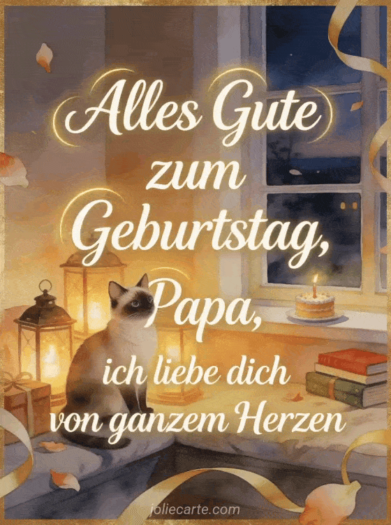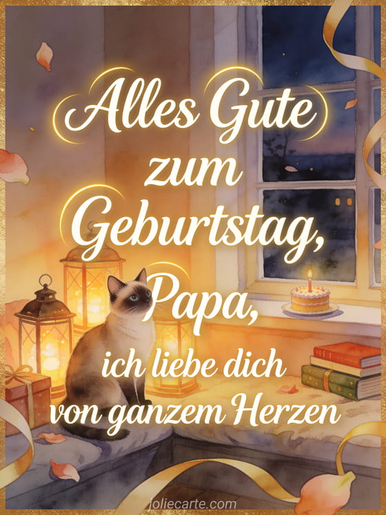 Teile einen berührenden Geburtstagstext für Papa mit einer Siamkatze neben leuchtenden Laternen, verpackten Büchern und einem kleinen Geburtstagskuchen auf einem gemütlichen Fenstersitz. Dazu passen alles gute zum geburtstag papa fotomontage, alles gute zum geburtstag papa text oder einfach alles gute zum geburtstag papa.