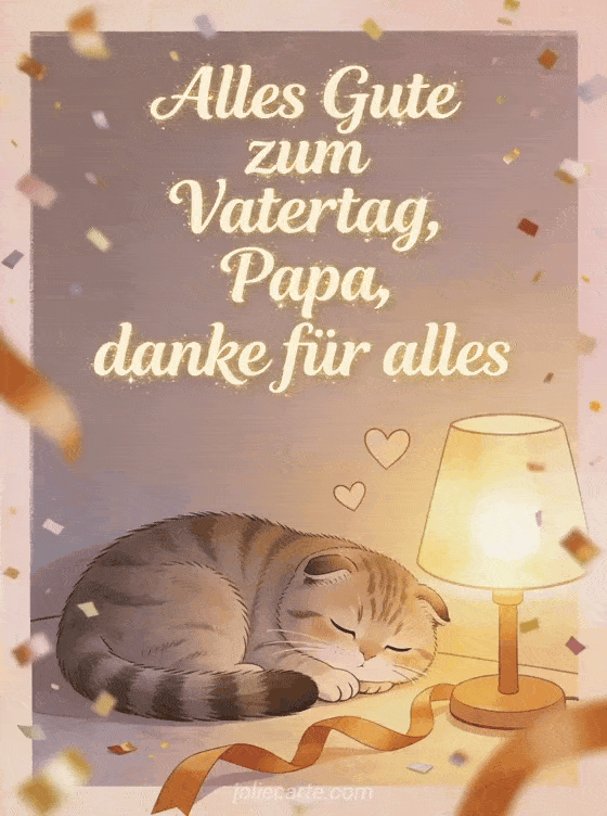 Versende Vatertag liebe Worte mit zarter cremefarbener Schrift, einer warmen Pastellillustration einer Scottish Fold Katze neben einer leuchtenden Tischlampe, kleinen Herzen, bernsteinfarbenen Schleifen und festlichem Konfetti. Entdecke auch einem Freund Alles Gute zum Vatertag wünschen, ein originelles Vatertags-GIF oder mein Schatz mein Liebling alles Gute zum Vatertag.