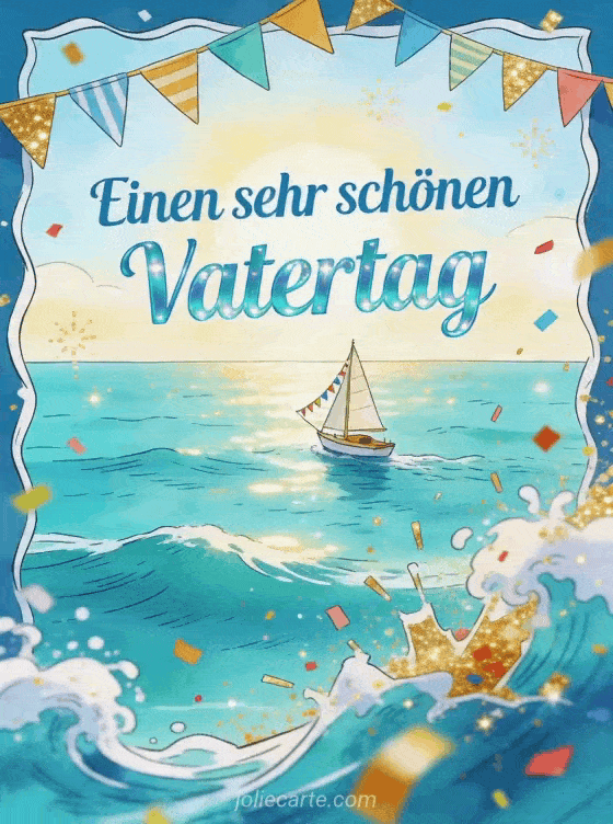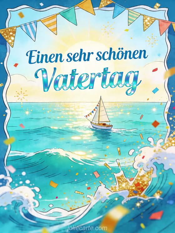 Teile ein sonniges Vatertagsbild mit einem kleinen Segelboot auf einer leuchtend türkisblauen Bucht, festlichen Wimpeln, glitzernden Wellen und fröhlichem Konfetti. Entdecke auch eine Guten Morgen Alles Gute zum Vatertag Karte, eine Hemd Vatertagskarte oder eine Vatertagskarte.