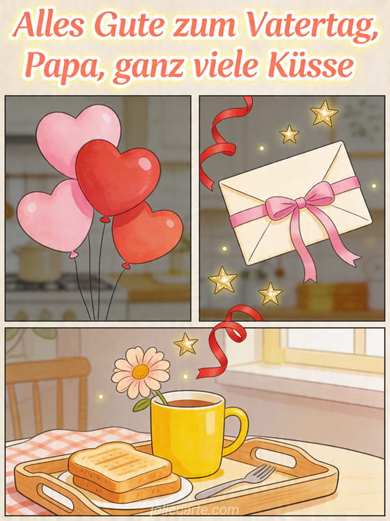 Teile eine lebendige illustrierte Vatertagskarte mit Herzballons, einem versiegelten Briefumschlag mit Schleife und einem gemütlichen Frühstückstablett mit heller Tasse. So sendest du Papa besonders süße Küsse. Entdecke auch eine Vatertag Karte, Alles Gute zum Vatertag an meinen Sohn und alle Papas oder eine Vorlage Vatertagskarte.