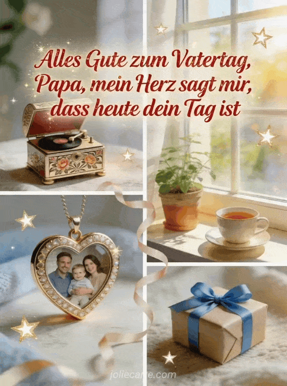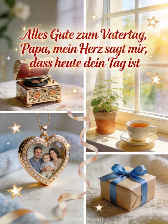 Teile eine berührende Vatertagskarte mit kleiner Spieluhr, Herzanhänger, sonnigem Fensterbrett und kleinem Geschenk mit blauer Schleife. Diese realistische Collage bringt einen zärtlichen emotionalen Glanz in Papas besonderen Tag. Entdecke auch Vatertagskarten, eine kostenlose Karte zum Vatertag oder Vatertag an meinen Sohn.