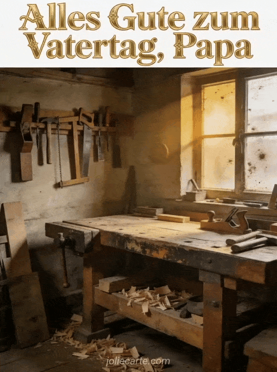 Senden Sie herzliche Vatertagsgrüße mit goldener Vintage-Typografie, einer Handwerkerwerkstatt, Holzwerkzeugen an der Wand, einer gealterten Werkbank und Holzspänen auf dem Boden. Entdecken Sie auch eine Vatertagskarte Pinterest, alle Papas der Welt Alles Gute zum Vatertag oder ein Bild zum Vatertag.