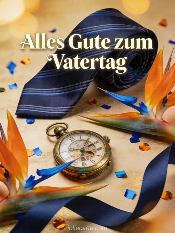 Sende eine elegante Vatertagskarte mit einer fotorealistischen Seidenkrawatte neben einer Messinguhr, Paradiesvogelblumen und festlichem blauem und bernsteinfarbenem Konfetti. Entdecke auch eine Alles Gute Papa Vatertagskarte, Vatertag liebe Worte oder einem Freund Alles Gute zum Vatertag wünschen.