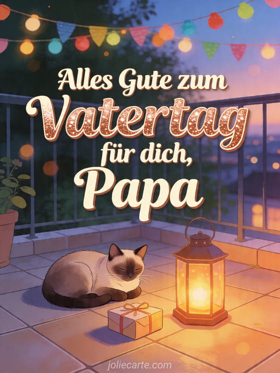 Sende Papa eine fröhliche illustrierte Karte mit einer Siamkatze, die neben einem kleinen Geschenk und einer leuchtenden Laterne auf einer gefliesten Terrasse liegt. Die warmen Abendfarben machen diesen Vatertagsgruß besonders liebevoll. Entdecke auch Vatertag Blumen, mein Schatz alles Gute zum Vatertag oder eine Vatertagskarte kostenlos.