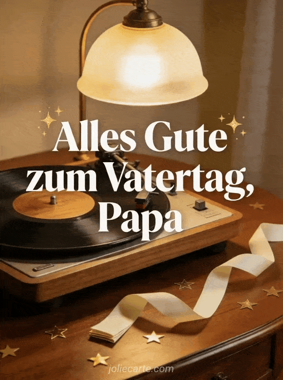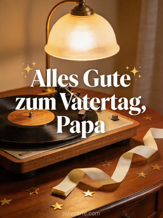 Teile eine gemütliche Vatertagskarte mit altem Plattenspieler, Schallplatte, warmem Lampenlicht, gefalteter Schleife und kleinen Sternkonfetti auf einem Walnussholztisch. Dieses nostalgische Motiv passt perfekt zu einem Papa, der Musik liebt. Entdecke auch alle Papas der Welt Alles Gute zum Vatertag, ein Bild zum Vatertag oder Bild alles Gute zum Vatertag Papa.