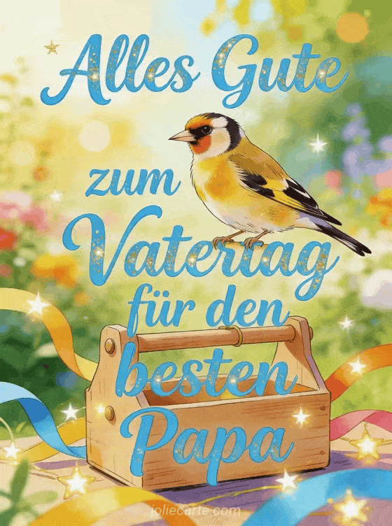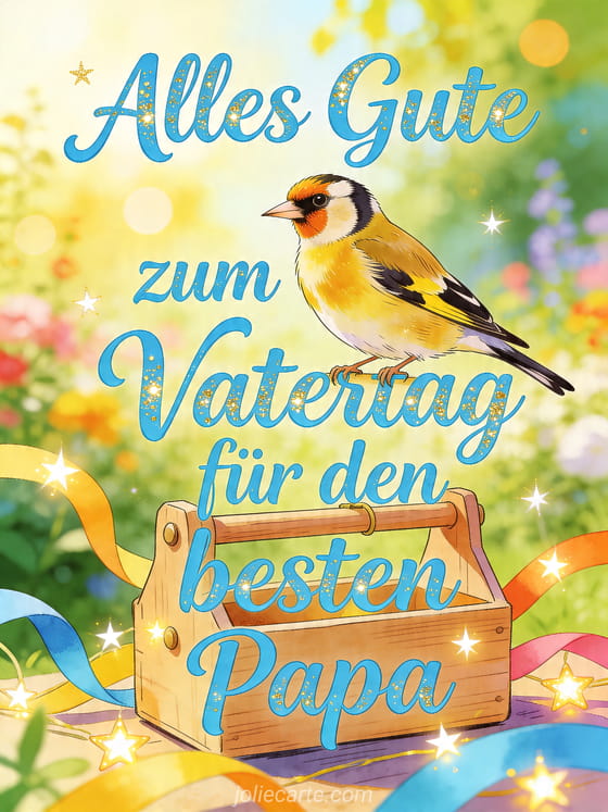 Feiere den besten Papa mit einer farbenfrohen illustrierten Karte, die einen Stieglitz auf einem kleinen hölzernen Werkzeugkasten zeigt, umgeben von hellen Schleifen und Sternlichtern in einem sonnigen Garten. Sie ist fröhlich, herzlich und schnell geteilt. Entdecke auch schönen Vatertag, Vatertag kurzes Zitat oder eine Alles Gute zum Vatertag Papa Karte.