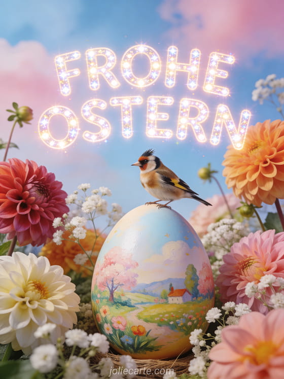 Erhellen Sie jemandem das Osterfest mit dieser strahlenden Videokarte. Ein bezaubernder Stieglitz sitzt auf einem riesigen Osterei, das mit einer Frühlingslandschaft bemalt ist, umgeben von leuchtenden Dahlien und Schleierkraut unter einem sanften Himmel. Entdecken Sie auch eine Ostergrüße-Karte oder eine Ostereier-Karte.
