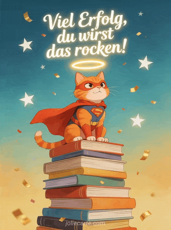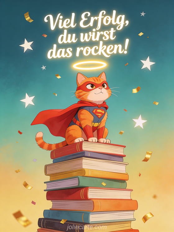Stärken Sie das Selbstvertrauen vor einer Prüfung mit dieser lustigen Karte mit einer roten Katze im Superheldenumhang auf einem Bücherstapel. Entdecken Sie auch eine Karte viel Erfolg Wettbewerb, eine Karte viel Erfolg Prüfungen oder eine Karte viel Erfolg Studium.