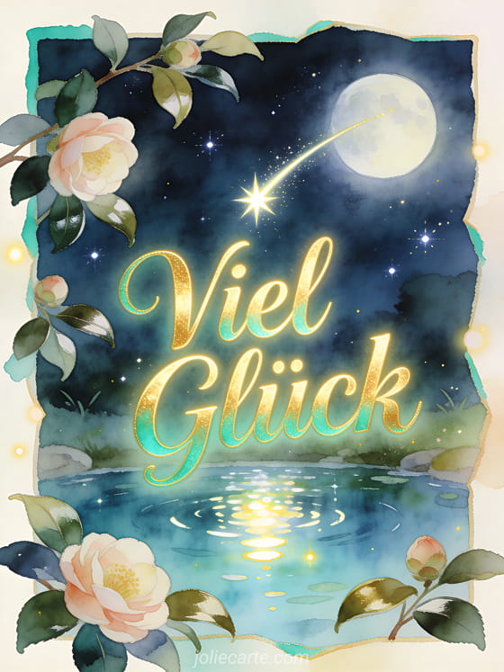 Teile einen Viel-Glück-Wunsch mit einer Sternschnuppe über einem klaren mondbeschienenen Teich, hellen Spiegelungen, Kamelien und glänzenden Blättern. Entdecke auch ein Viel Glück für morgen Bild, Wünsche für viel Glück oder kostenlose Viel Glück Bilder.