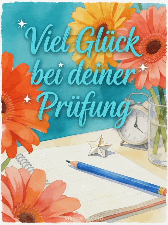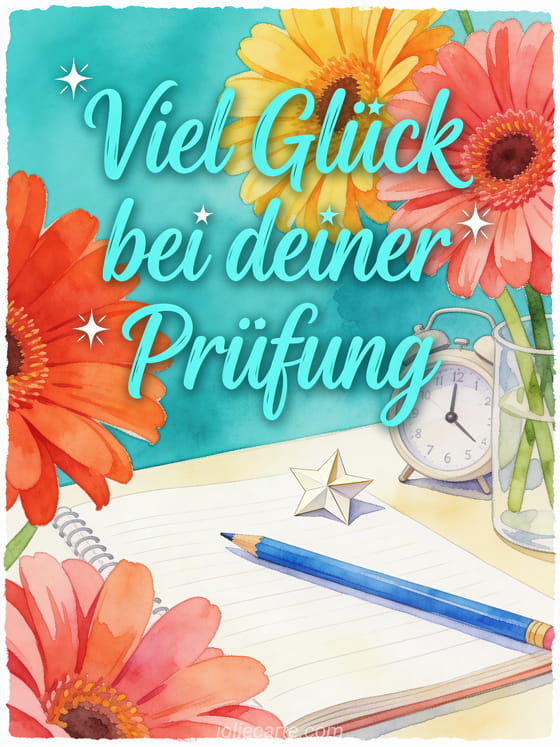 Sende eine konzentrierte Glückwunschkarte zur Prüfung mit klarer türkisfarbener Kalligrafie, kleinen Sternblitzen, einem blauen Bleistift, einer kleinen Uhr, einem Papier-Glücksstern und leuchtenden Gerbera. Dazu passen auch ein Text viel Glück neuer Job, eine Viel-Glück-Nachricht oder ein Auf Wiedersehen und viel Glück Text.