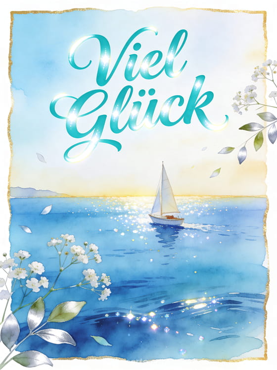 Sende Viel Glück mit türkisfarbener Schrift, einem kleinen Segelboot auf einer hellblauen Bucht, Schleierkrautblüten und goldenem Licht. Entdecke auch Nachricht für viel Glück zur Prüfung, Karte viel Glück dabei bessere Kollegen als uns zu finden oder viel Glück GIFs.